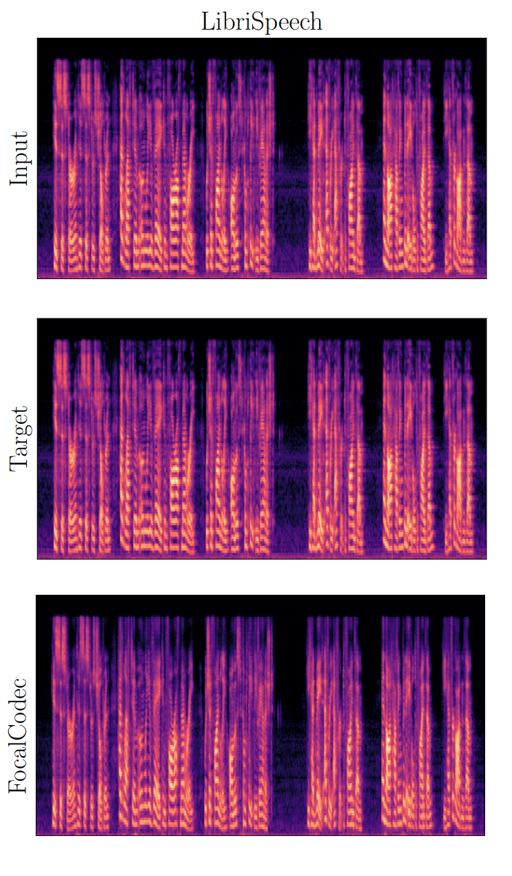 Sur cette figure, nous présentons un résultat qualitatif montrant que FocalCodec peut compresser et reconstruire la parole avec une perte de qualité minimale. Comme vous pouvez le voir, les spectrogrammes du signal d'entrée, de la cible et du signal reconstruit par FocalCodec sont presque indiscernables.