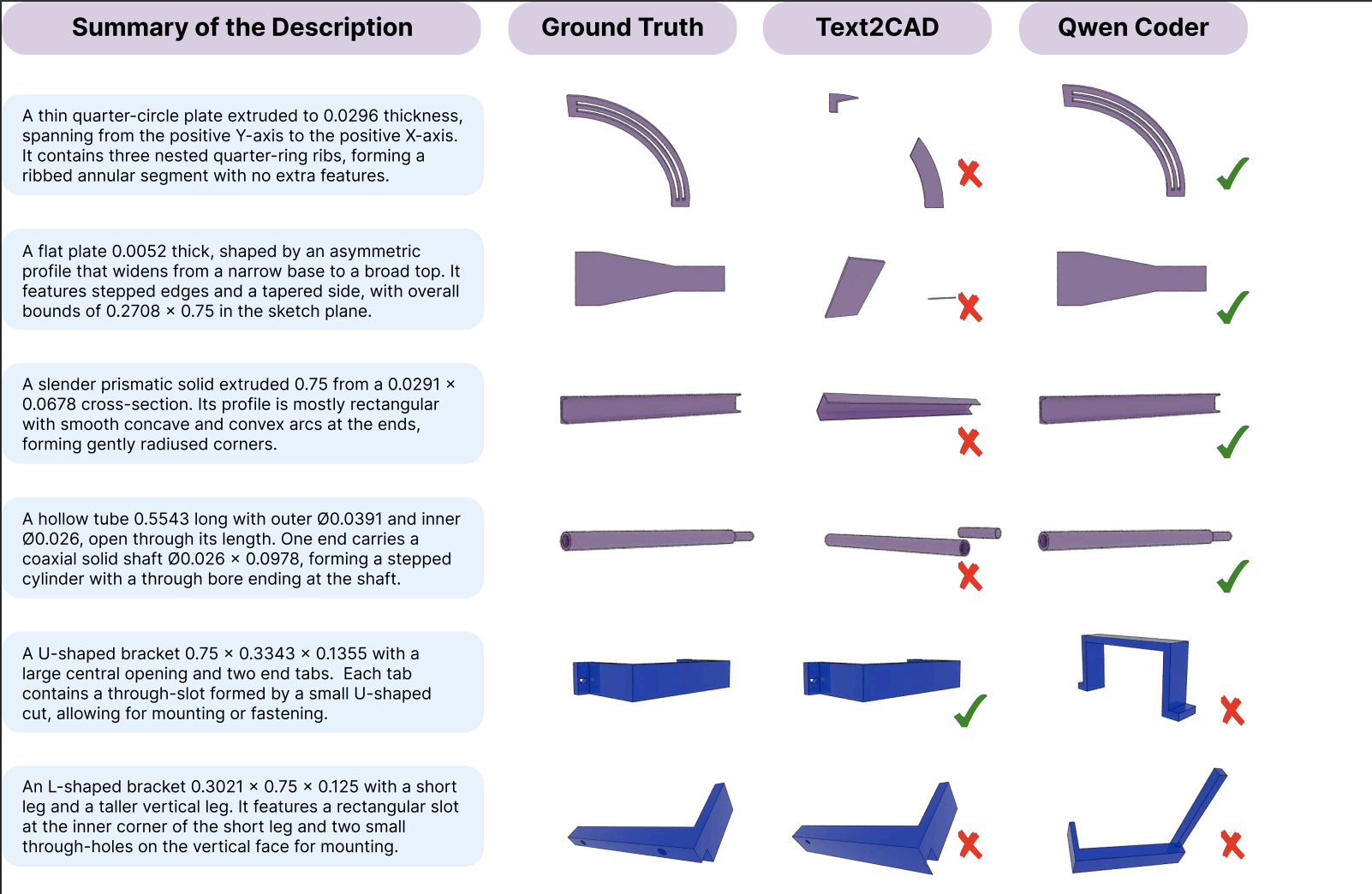 Au lieu d'inventer de nouvelles méthodes de traduction pour représenter les données 3D, comme des tokenizers personnalisés ou des représentations vectorielles sur mesure, nous traitons la CAO comme du code pur. Cela nous permet de tirer parti de Qwen2.5-Coder, un modèle éprouvé et optimisé pour suivre des instructions de programmation, garantissant ainsi une architecture simple, efficace et flexible.