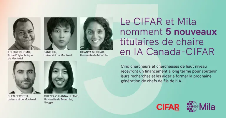 Cinq membres de Mila ont été nommés titulaires de chaire en IA Canada-CIFAR en reconnaissance de leur leadership. Ces personnes enrichissent l’écosystème canadien grâce à leur vaste expertise, qu’il s’agisse de causalité, de traitement du langage naturel, de génie logiciel ou de musique générée par l’IA. Ils se joignent à un écosystème québécois d’IA florissant qui s’articule autour de Mila, l’un des trois instituts nationaux d’IA créés en 2017 dans le cadre de la Stratégie pancanadienne en matière d’IA.