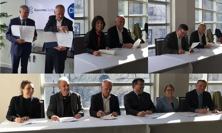 Étaient présents à la cérémonie de signature : Frédéric Sanchez, du consulat général de France, Rémi Quirion, scientifique en chef au Québec, Antoine Petit (CNRS), Laurence Beaulieu (Mila), Suzanne Fortier (Université McGill), François Gagnon (ÉTS), Michel Guidal (Université Paris-Saclay) et Franck Richecoeur (École CentraleSupélec).