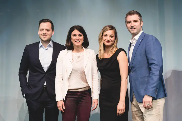 De gauche à droite sur la photo :Félix Bernard, avocat chez Langlois Avocat, Valérie Pisano, pdg de Mila, Sarah Houde, pdg de Propulsion Québec, Louis Tremblay, président du conseil d'administration de Propulsion Québec.